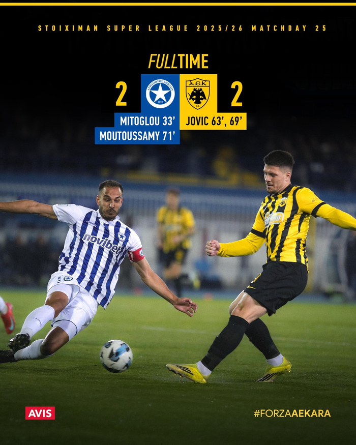 #希腊超# 雅典AEK客场2:2阿特罗米托斯队,首发打满全场的约维奇🇷🇸梅开二度。⚽